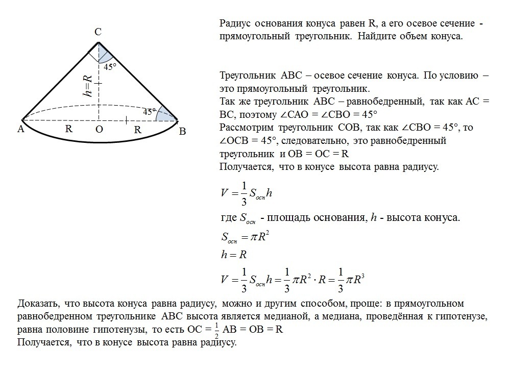 Радиус основания конуса равен R, а его осевое сечение - прямоугольный треугольник. Найдите объем конуса.