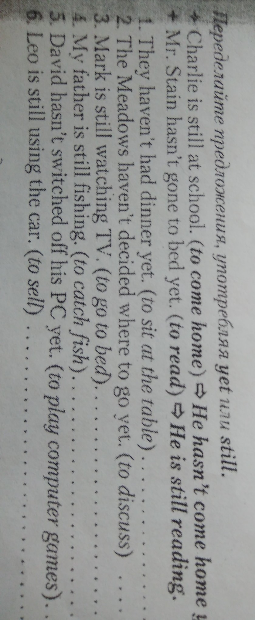 1. They are still sitting at the table. 2. The Meadows are still discussing where to go. 3. Mark hasn't gone to bed yet. 4. My father hasn't caught fish yet. 5. David is still playing computer games. 6. Leo hasn't sold his car yet.