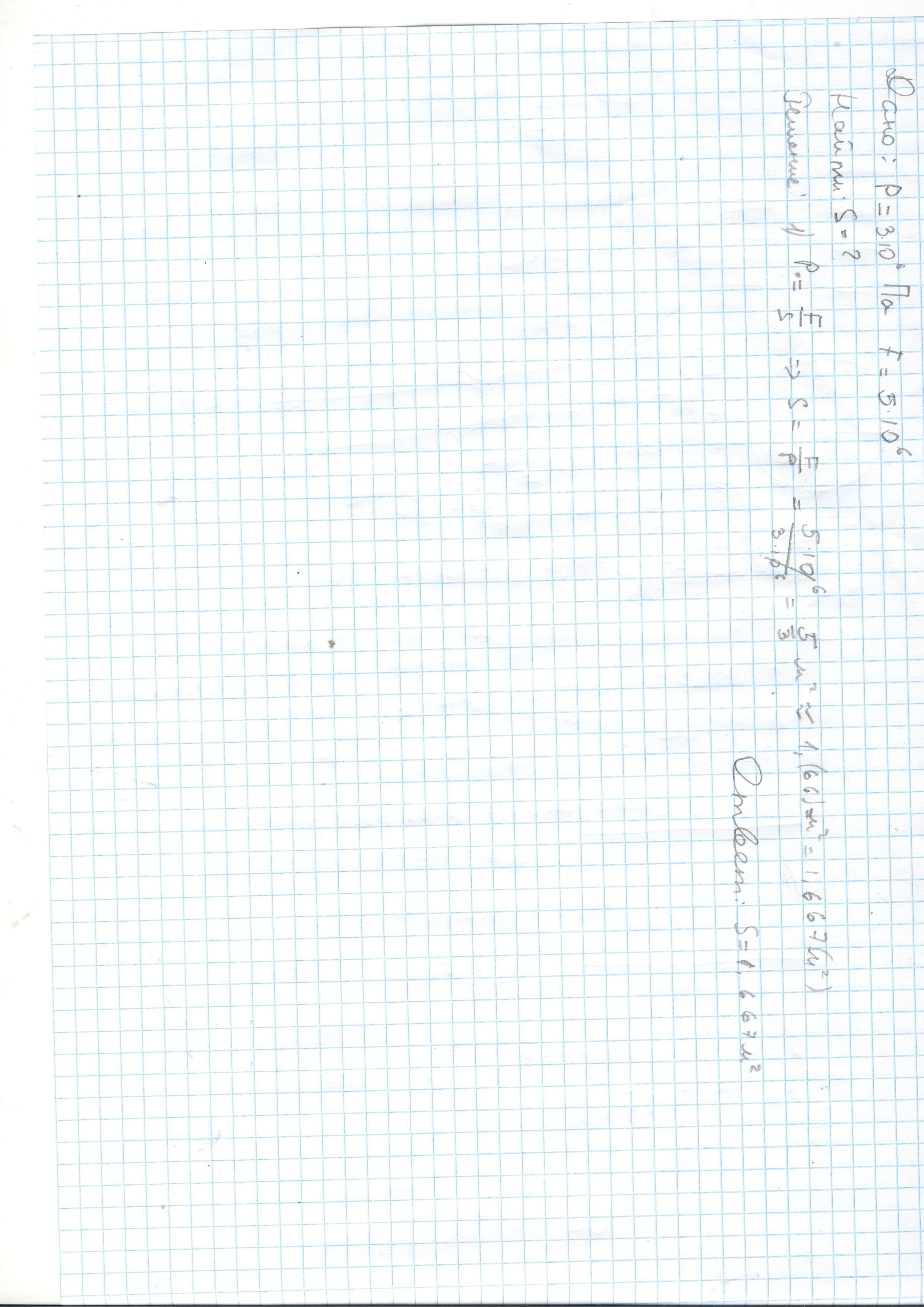 Фанера присуется под давлением Р=3*10 в шестой степени ПА .Определите площадь листа фанеры ,на которую действует сила давления модуль которой F= 5*10 в шестой H .Помогите очень срочно !!!!!