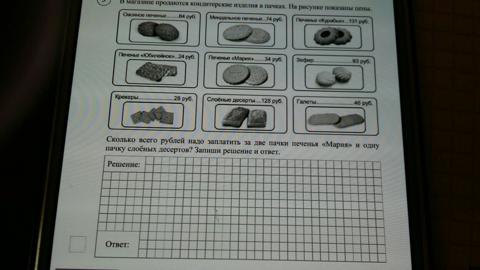 в магазине продаются кондитерские изделия в пачках. На рисунке показаны цены. Сколько всего рублей надо заплатить за 2 пачки печенья Мария и одну пачку слоёных десертов? Запиши решение и ответ.