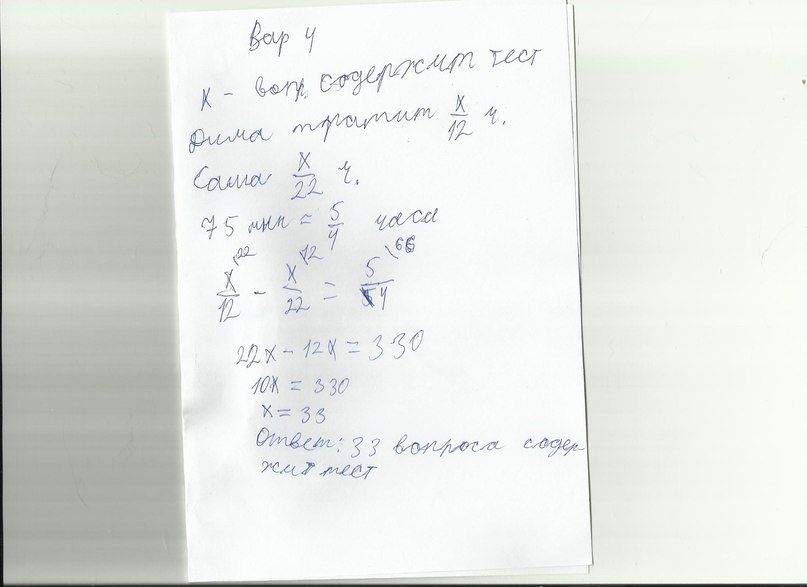 Дима и Саша выполняют одинаковый тест. Дима отвечает за час на 12 вопросов теста, а Саша - на 22. Они одновременно начали отвечать на вопросы теста, и Дима закончил свой тест позже Саши на 75 минут. Сколько вопросов содержит тест?