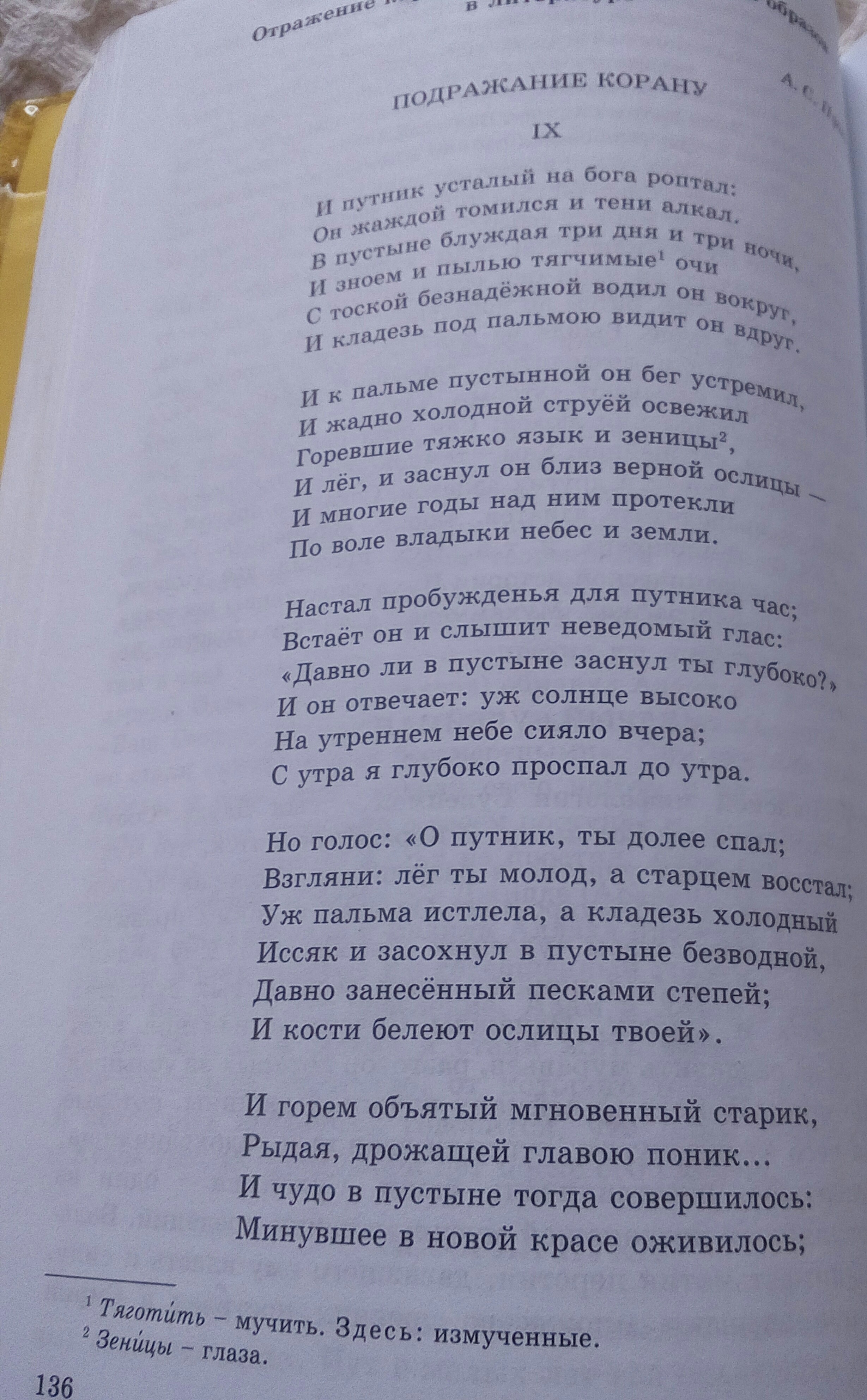 2.«Подражание Корану» – это стихотворный цикл, состоящий из девяти частей. Каждая часть – отдельное произведение. В каждой части повествуется история из жизни пророка Мохаммеда. Но они связаны одной общей идей, темой и смыслом.