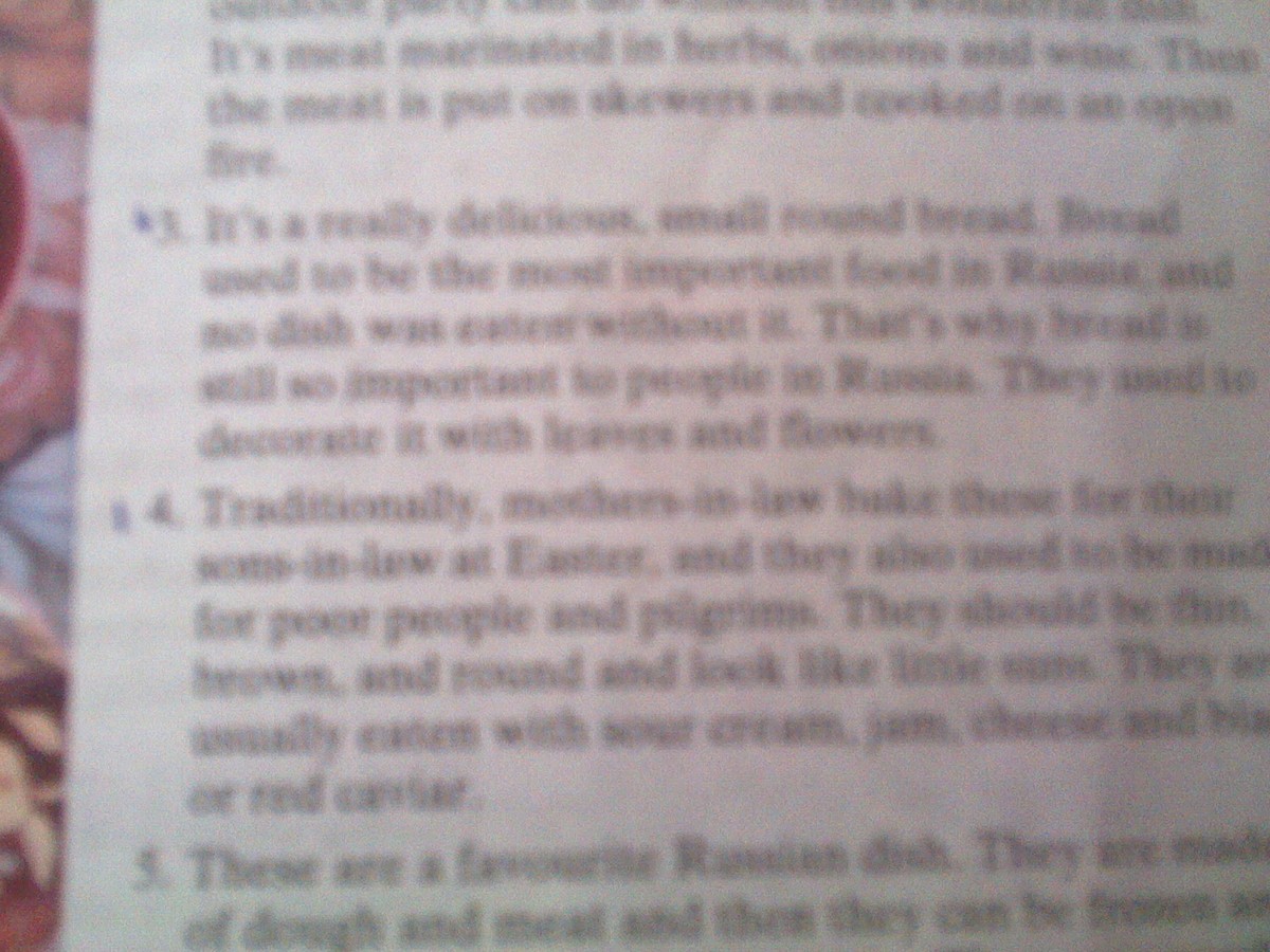 3. Это очень вкусный маленький круглый хлеб. Хлеб всегда был самой важной едой в России, и ни одного блюда без него не ели. Поэтому хлеб так важен для русских людей. Они украшают его узорами из цветов.
