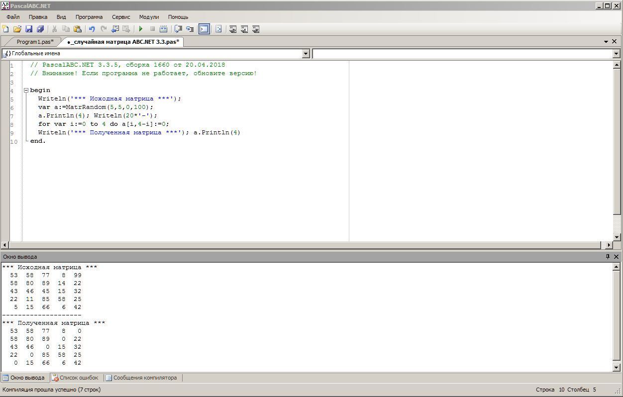 заполнить квадратный массив размером 5×5 случайными числами в диапазоне до 100 затем заполнить нулями вспомогательную диагональ и вывести на экран