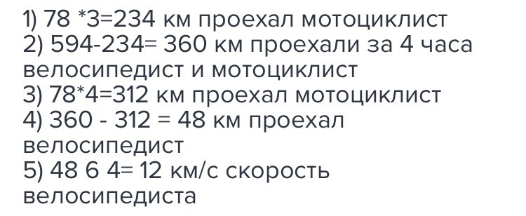 из деревни выехал мотоциклист со скоростью 78 кмчас. Через 3 часа из той же деревни в противоположном направлении выехал велосипедист. Через 3 часа после выезда велосипедиста расстояние между ними стало 594 км. Найдите скорость велосипедиста.