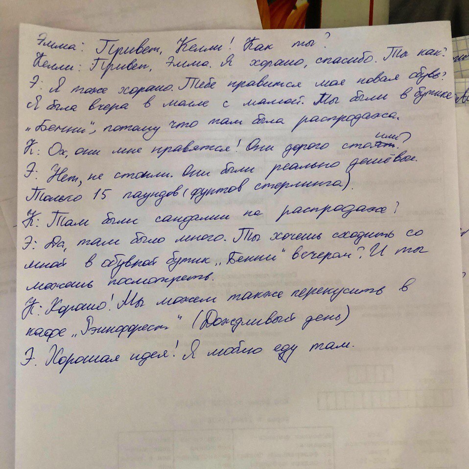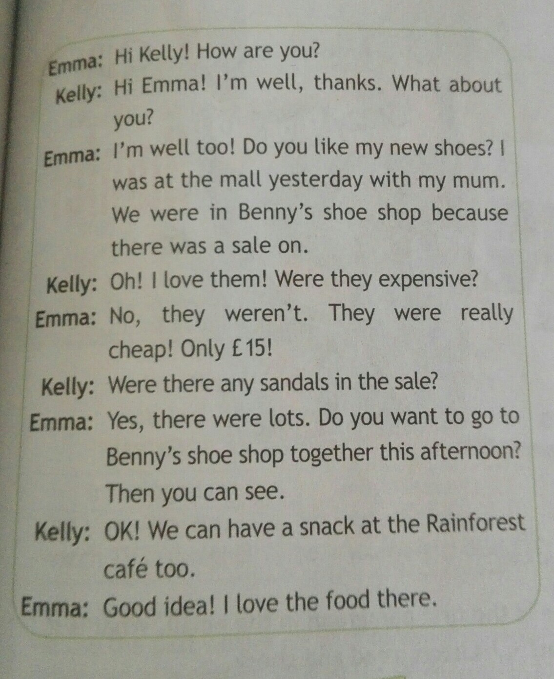 Эмма:Я тоже в порядке!Тебе нравиться моя новая обувь?Я был(а) в торговом центре вчера со своей мамой.Мы были в магазине Бэнни потому что там были скидки.