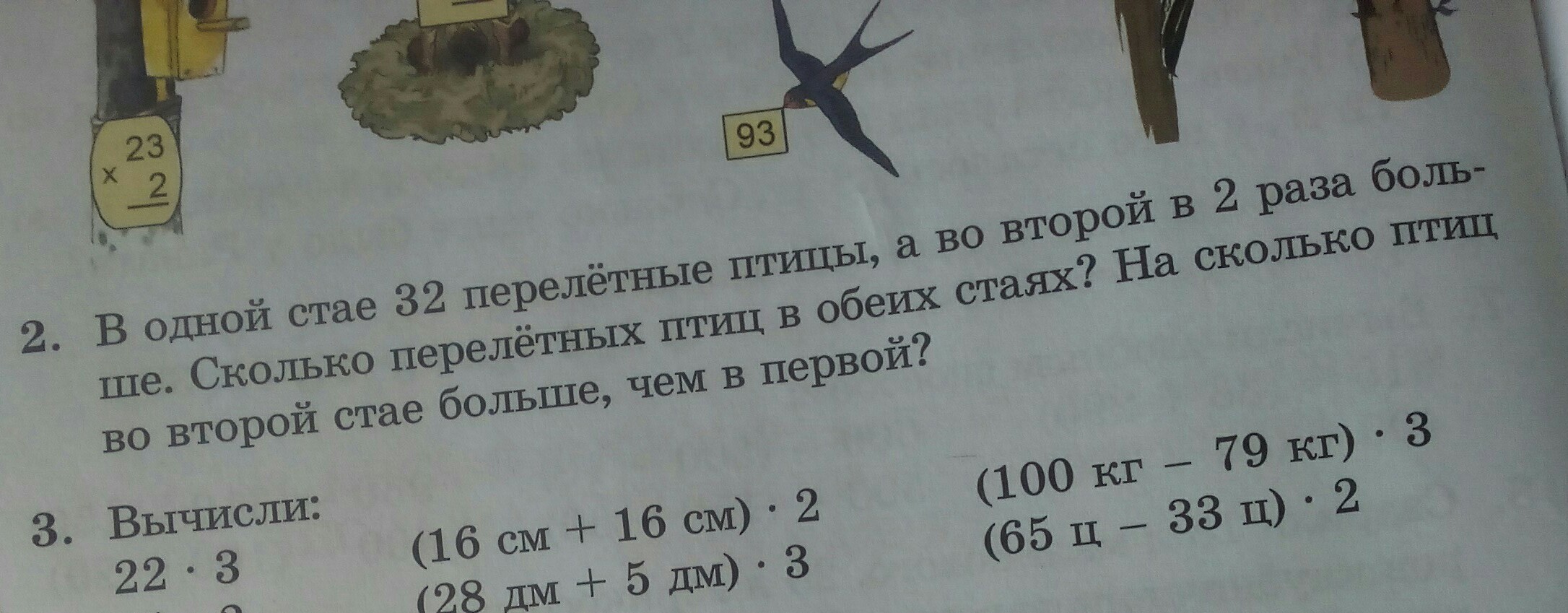 ответ: в обеих стаях 96 птиц, во второй стае птиц больше на 32.