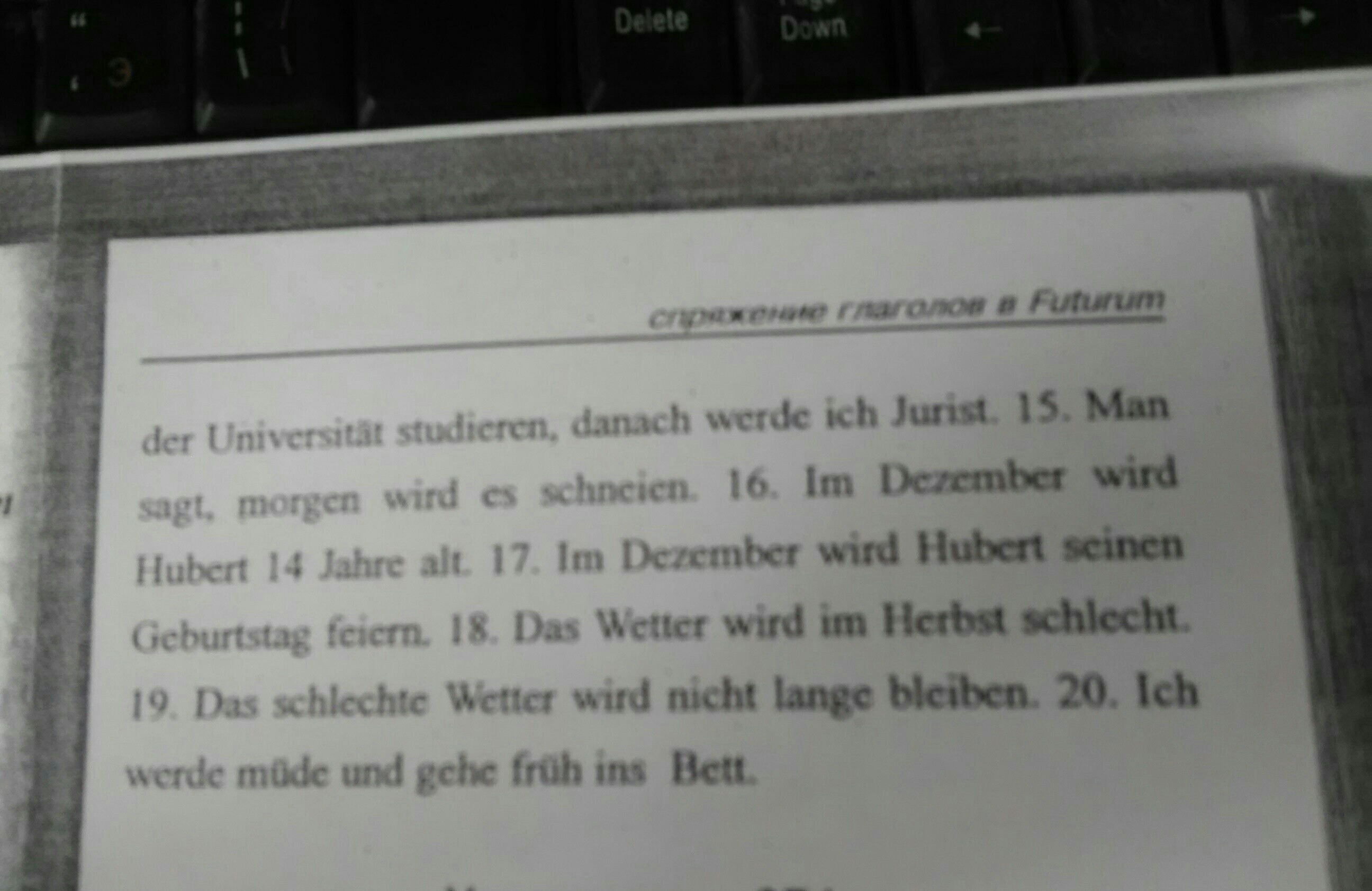 15. Говорят, завтра выпадет снег.16. В декабре Губерту исполнится 14 лет.17. В декабре Губерт будет праздновать свой день рождения.18. Осенью погода становиться плохой.19. Плохая погода не будет длиться долго.20. Я устаю и рано ложусь спать.