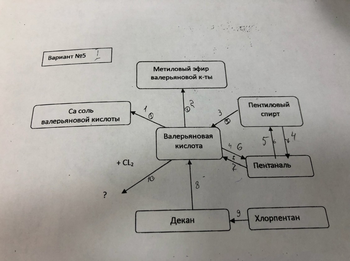 10) СН3-СН2-СН2-СН2-СООН + Cl2 -(Pкрасный)-> СН3-СН2-СН2-СН(Cl)-СООН (а-хлорпентановая кислота) + HCl