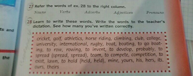 Verbs: to row, to invent, to develop, to spread, to complete, to exist, to hold, go boating