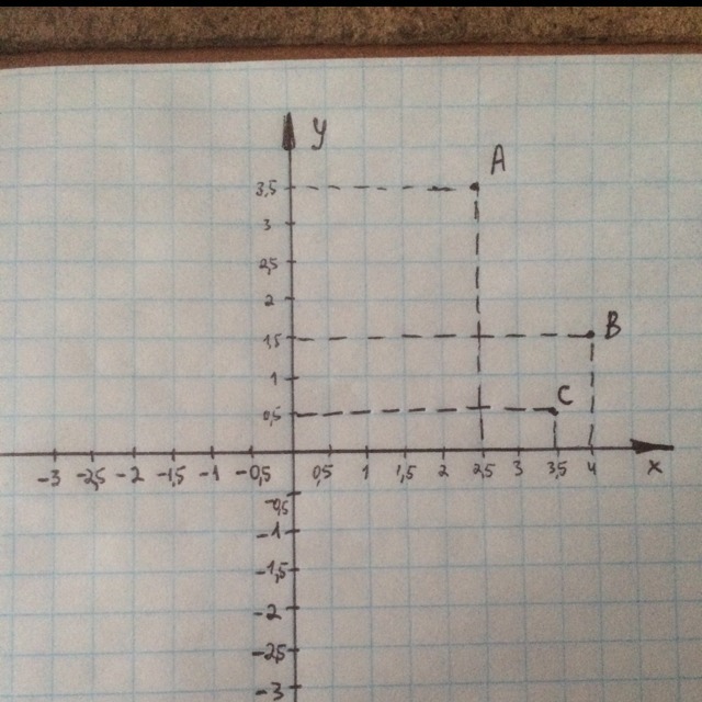 Первая точка, пусть будет точка А с координатами (2,5; 3,5), вторая точка В (4; 1,5), и третья С (3,5; 0,5).