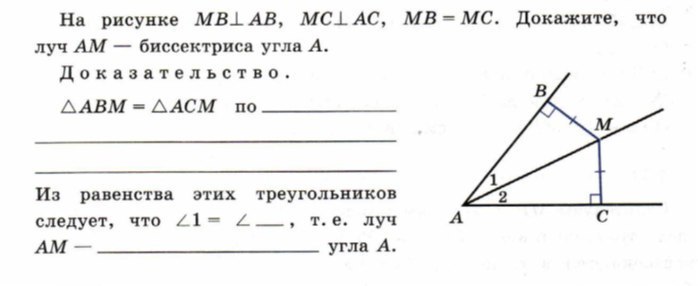 угол 1=углу 2,т.е. луч АМ-биссектриса угла А.