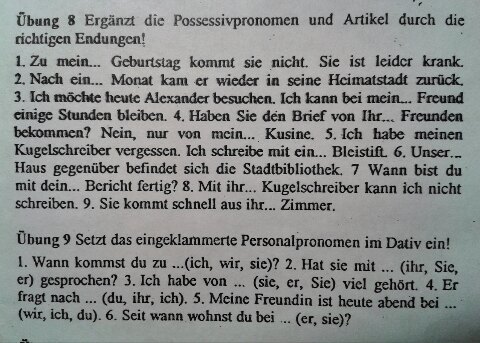 1) zu meinem, 2) nach einem, 3) bei meinem, 4) von Ihren, 5) mit einem, 6) unserem Haus, 7) mit deinem, 8) mit ihrem, 9) aus ihrem.