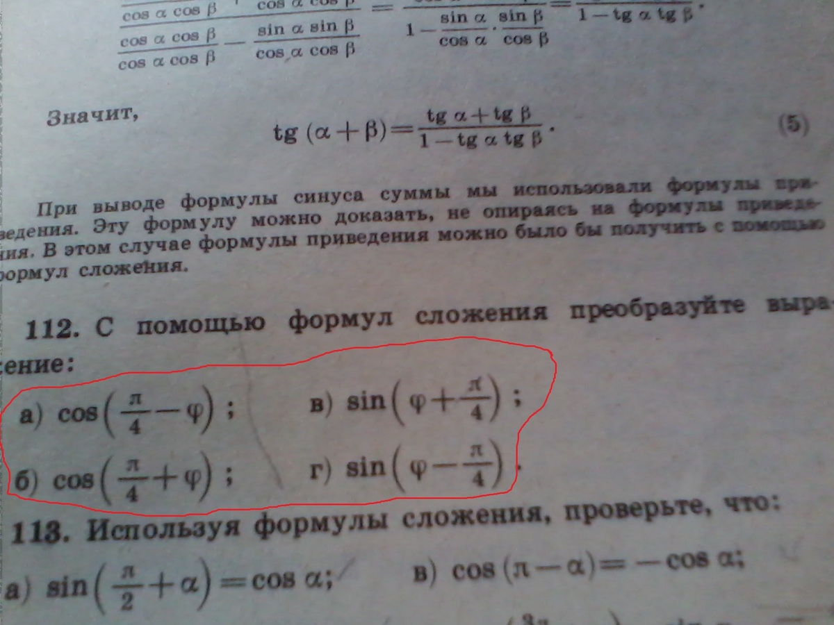 в) sin(a+pi/4)=sinacospi/4+sinpi/4cosa=корень(2)/2*(cosa+sina)