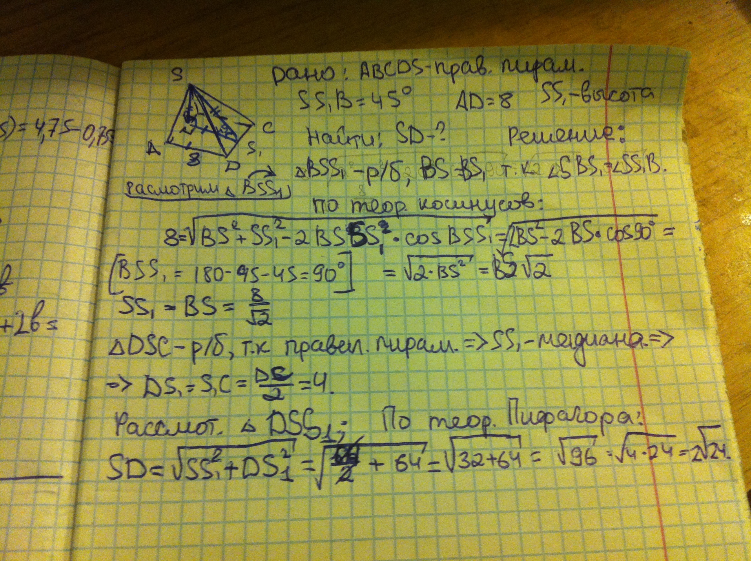 Найдите боковое ребро правильной четырёхугольной пирамиды все боковые грани которой, наклонены к плоскости основания под углом 45°, если сторона основания равна 8 см.