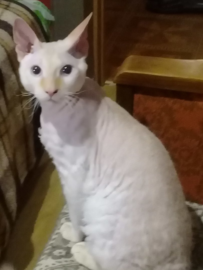 Только, он не совсем белый. Уши, нос, лапы и хвост- рыжеватые, папа ласково называет его «ржавый кот». Глаза серые, усы длинные, пышные, придающие морде серьезное, деловое выражение. Весит наше чудо около 14 кг.