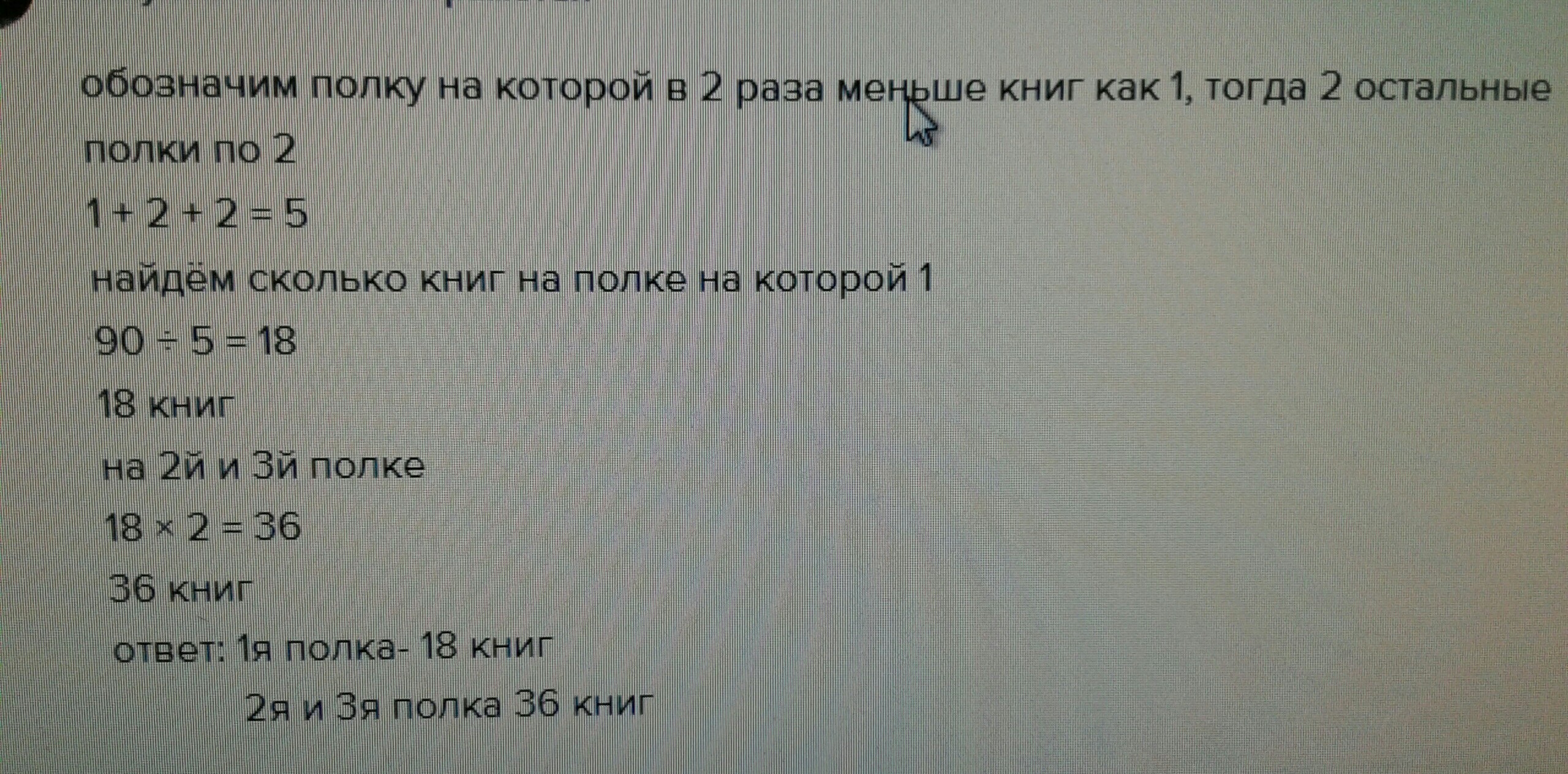 на 3 полках 90 книг на одной из них два раза меньше книг чем на каждой из двух других сколько книг на каждой полке.