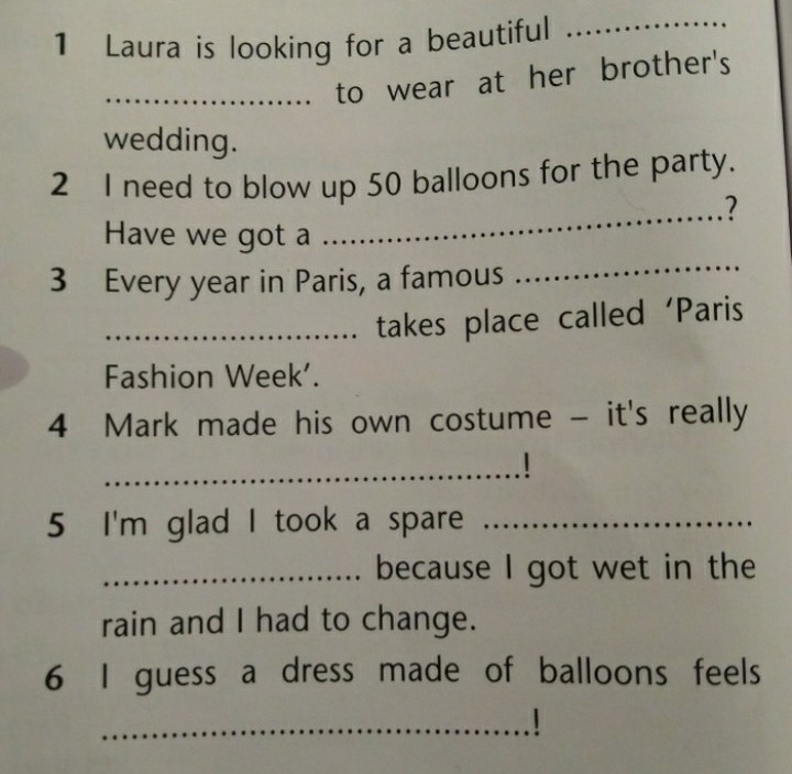 Вставьте слова:fashion show, hand pump, evening dress, set of clothes, lighter than air, one of a kind....