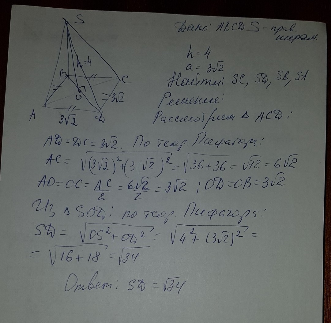 найдите боковое ребро правильной четырёхугольной пирамиды если сторона основания равна 3корня из 2 а высота пирамиды равна 4