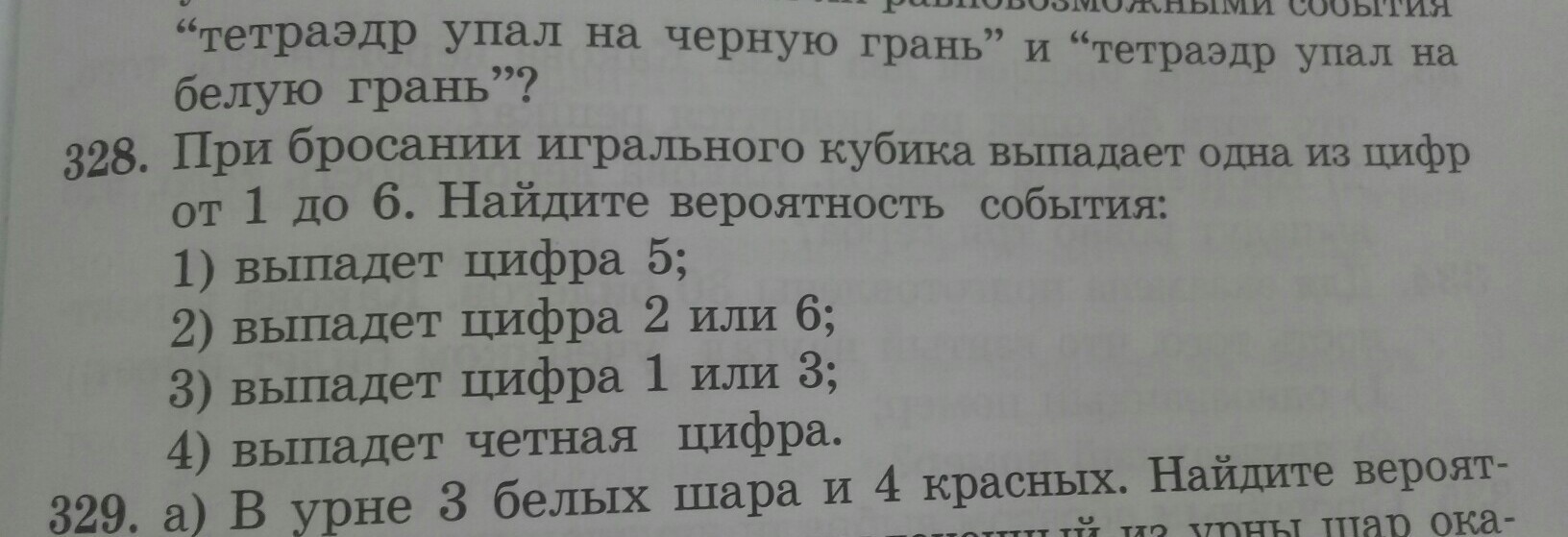 На кубике 6 цифр, вероятность того, что выпадет 5 равна 1/6; выпадет 2 или 6 - 2/6 (так как два числа, вероятность больше)