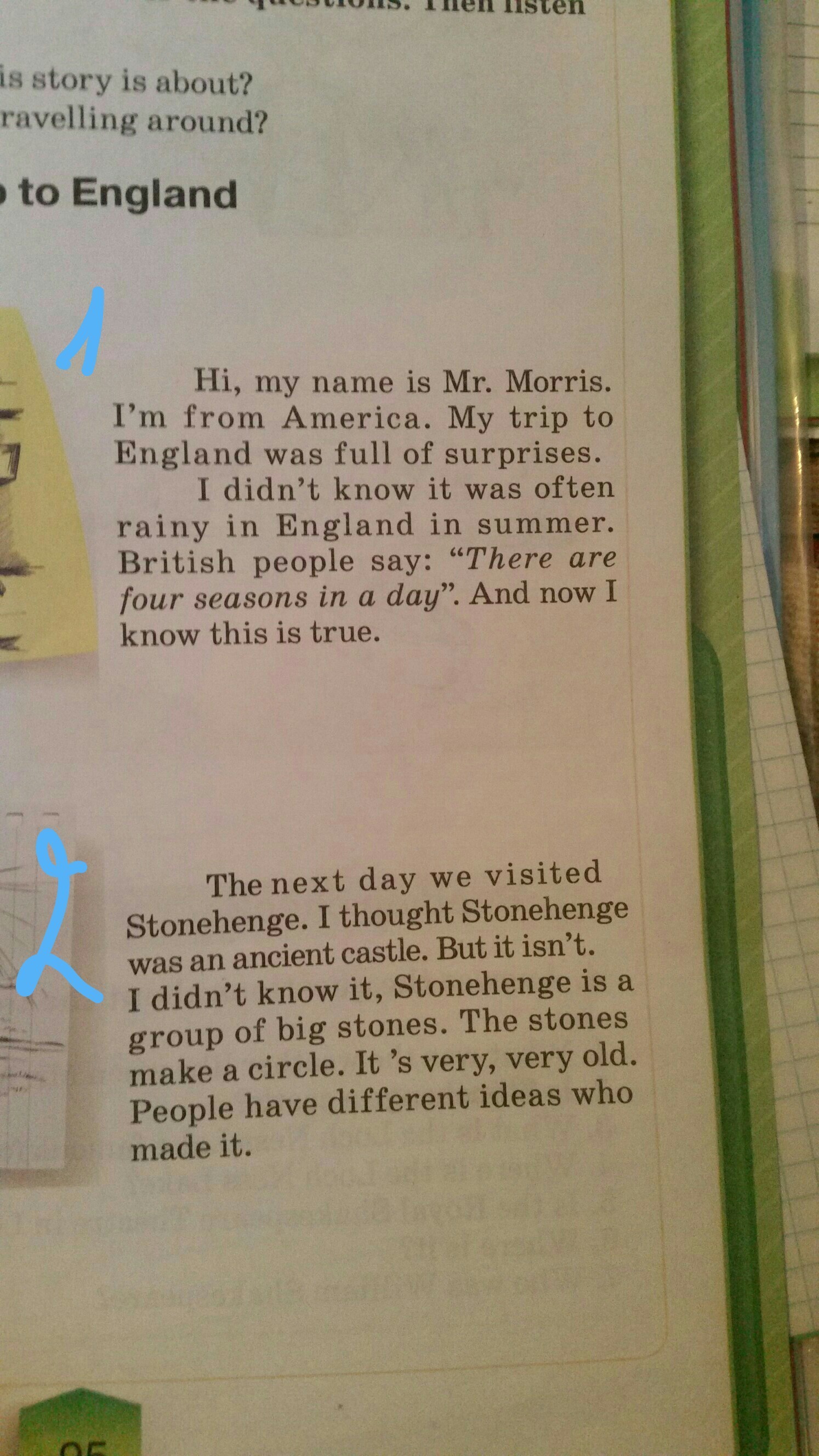 2. На следующий день мы посетили Стонхендж. Я думал что Стонхендж это древний замок. Но я ошибался. Я не знал что Стонхендж это группа больших камней. Они очень и чень старые. У людей много догадок о том кто их создал