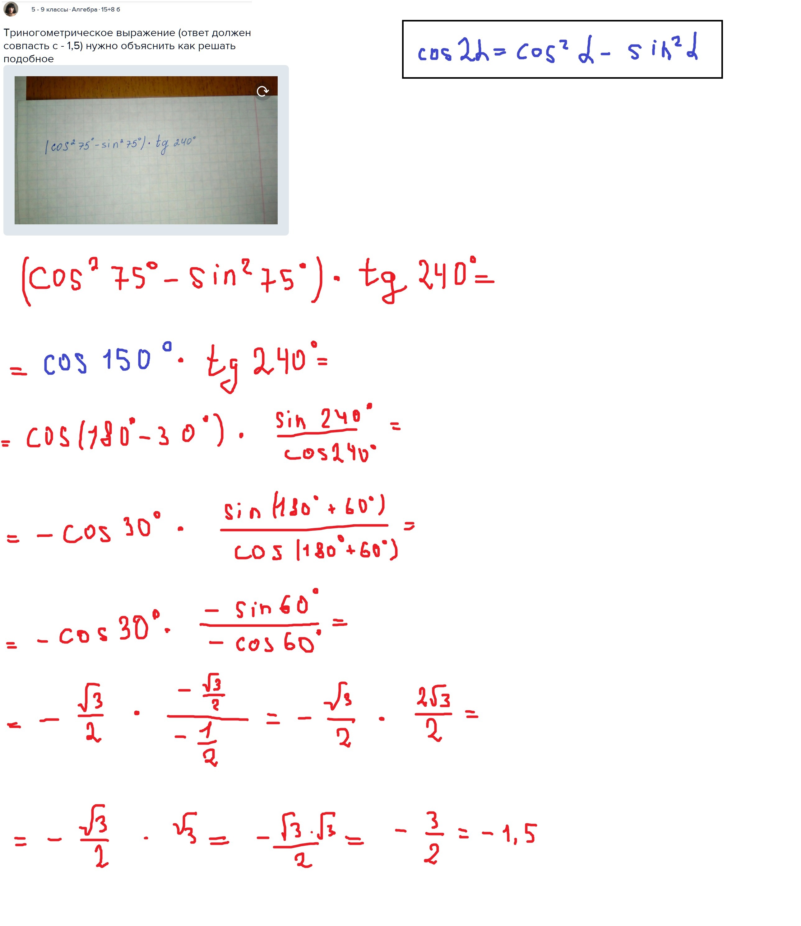 триногометрическое выражение (ответ должен совпасть с - 1,5) нужно объяснить как решать подобное