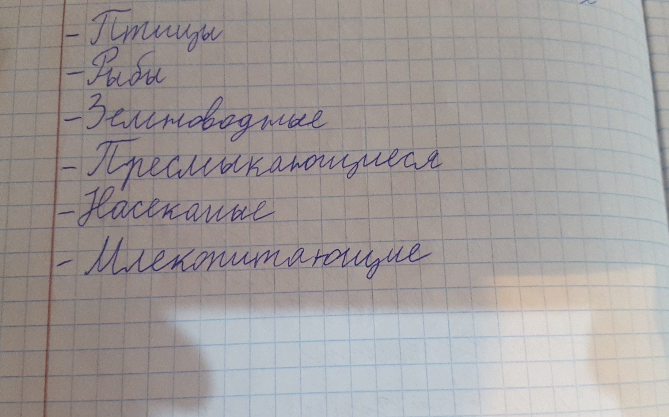 млекопитающие: коровы, лошади, кошки насекомые: муравьи, жуки, бабочки пресмыкающиеся: змея, ящерица, хамелион. земноводные: крокодил, черепаха, жаба. рыбы: хищные акула, рыба меч, сазан. птицы: хищные коршун, беркут, ястреб, домашние гусь, курица. водоплавающие фламинго, пеликан, лебедь, утки.