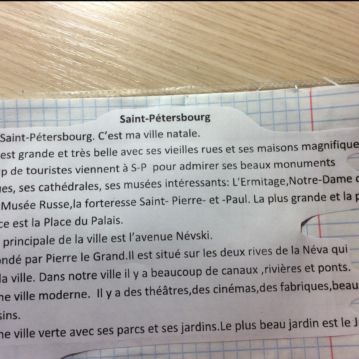 Санкт-Петербург. Это мой родной город. Он очень большой и очень красивый со своими старинными улицами и великолепными домами. Очень много туристов приезжают в Санкт-Петербург, чтобы полюбоваться его красивыми памятниками... соборами, интересными музеями: Эрмитаж, Нотр-Дам де Пари, государственный русский музей, Петропавловская крепость. Самая большая и самая(тут обрезано)... - Дворцовая площадь.