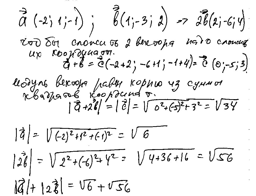 Даны два вектора a( -2;1;-1) и b(1;-3;2).Найдите |a+2b| и |a|+|2b|