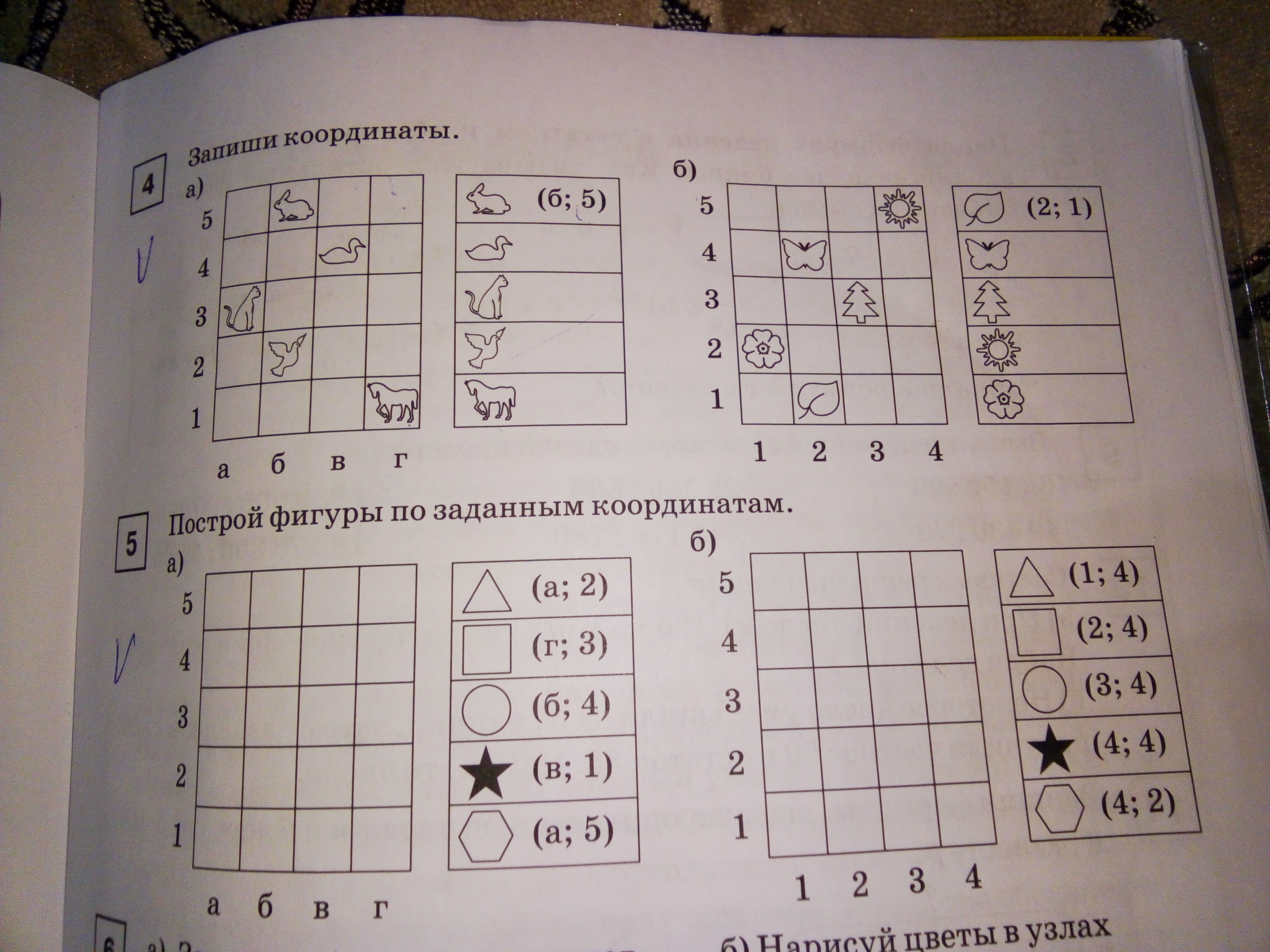 Я помогу только с четвёртым заданиемА) утка В4,Кошка А3 голубь Б2,лошадь Г1 Б)Бабочка24 ,ёлка33 цветок12,солнце45