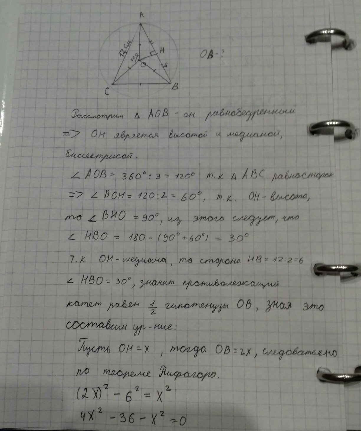 Треугольник EDC равносторонний со стороной 12 см. вписан в окружность. Найти радиус. По теорема Пифагора и по свойства медиан