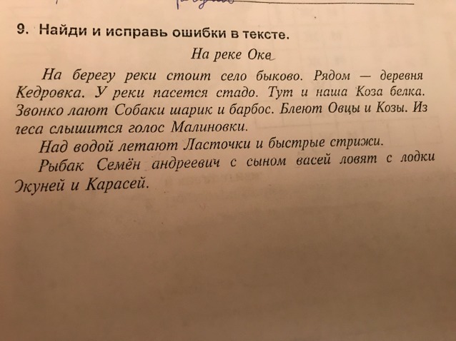 Быково (б. буква), коза (м. буква), Белка (б. буква), собаки (м. буква), Шарик (б. буква), Барбос (б. буква), овцы и козы (м. буквы), ласточки (м. буква), Семен Андреевич (б. буква), с сыном Васей (б. буква), окуней и карасей (м. буквы)