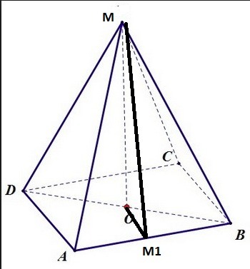 ABCDM - пирамида. АВСД - квадрат, сторона которого равна 4. Точка О - точка пересечения диагоналей. Высота, проведенная из вершины M к точке О равна двум. Найти площадь полной поверхности.