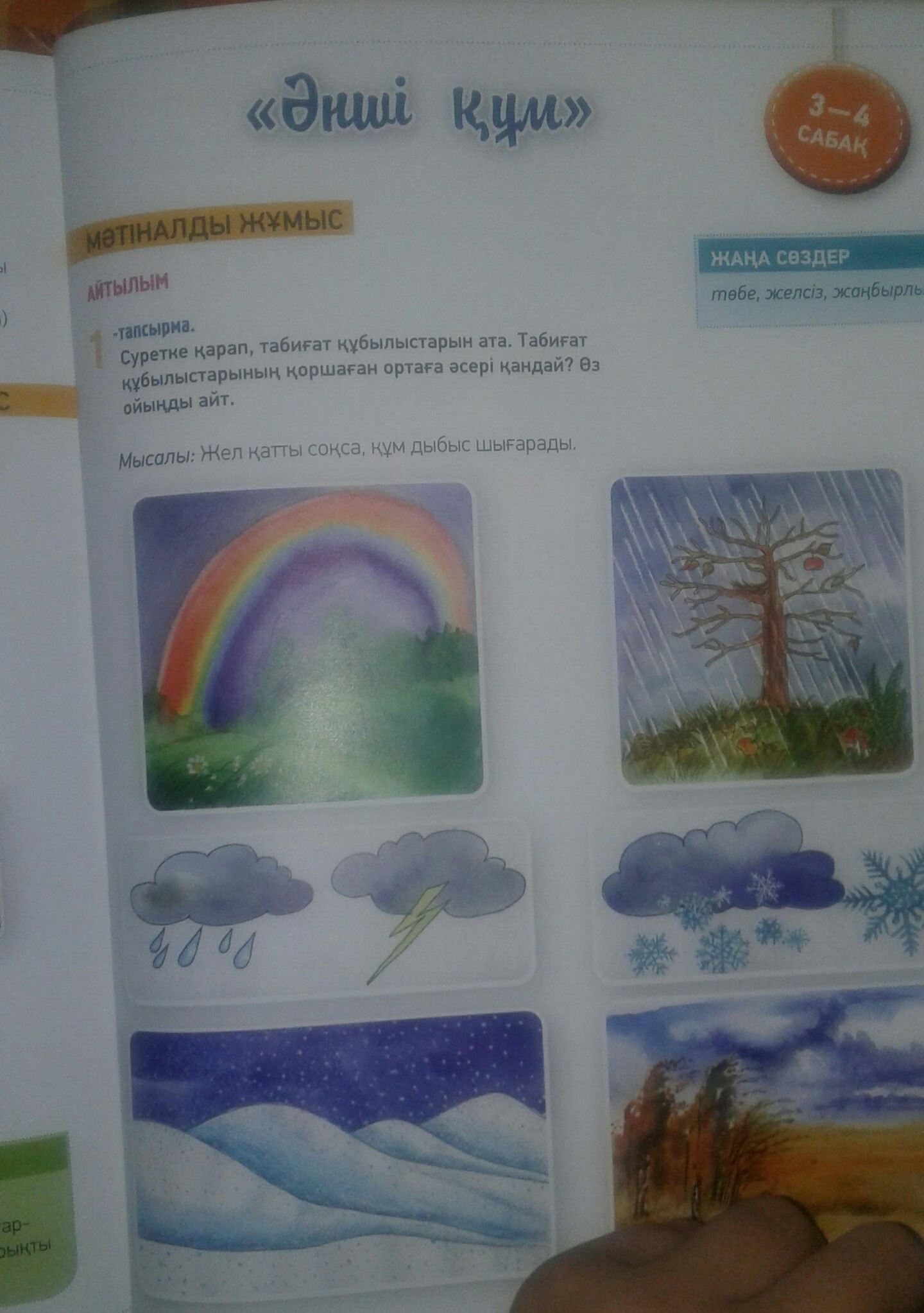 жауын жауғаннан кейін кемпірқосақ шығады.Күзде жауын жауған кезде найзағай жаркылдайды.Жауыннан қыста қар жауады.күзде жапырақтар сарғаяды.Кар жауған кезде жердің бетін кар жауып тастайды