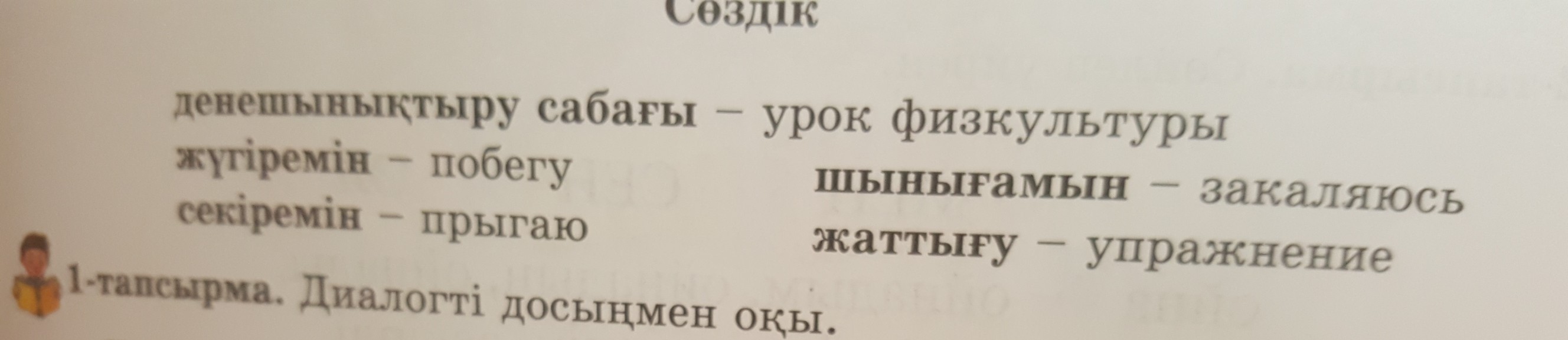 Бүгін бізде денешынықтыру сабағы. Дене сабағында мен жүгүремін,секіремін. Ағайымыз бізбен бірге жаттығу жасайды. Бірақ әр сабақта мен шынығамын. Дене сабағы маған өте ұнайды.