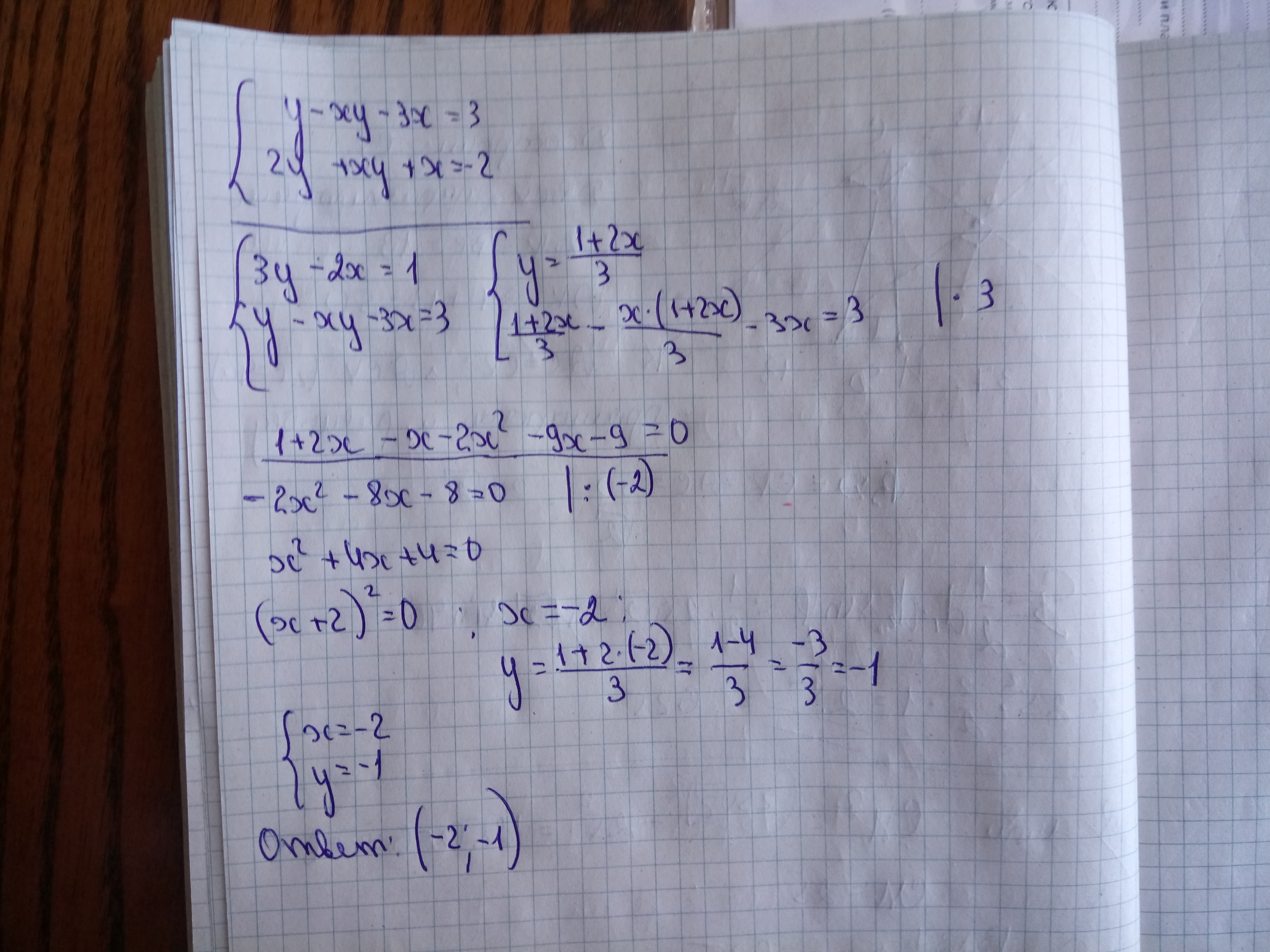 Первое плюс второе. Выбираем любое и решаем способом подстановки. Далее квадратное уравнение и видим, что это квадрат суммы. Всё коротко и просто. Решение задания приложено