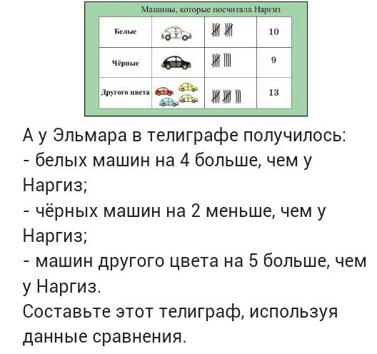 Наргиз И Эльмар считают сколько машин разного цвета проезжает под окнами их дома в течение 10 минут. Лучший способ для этого ставить черточку напротив названия цвета в таблице каждый раз когда проезжает машина этого цвета. Наргиз использовала этот способ и построила таблицы чёрточек :