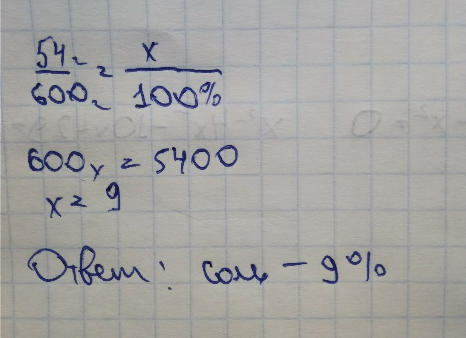каково процентное содержание соли а растворе,если в 600г раствора содержится 54 г соли?