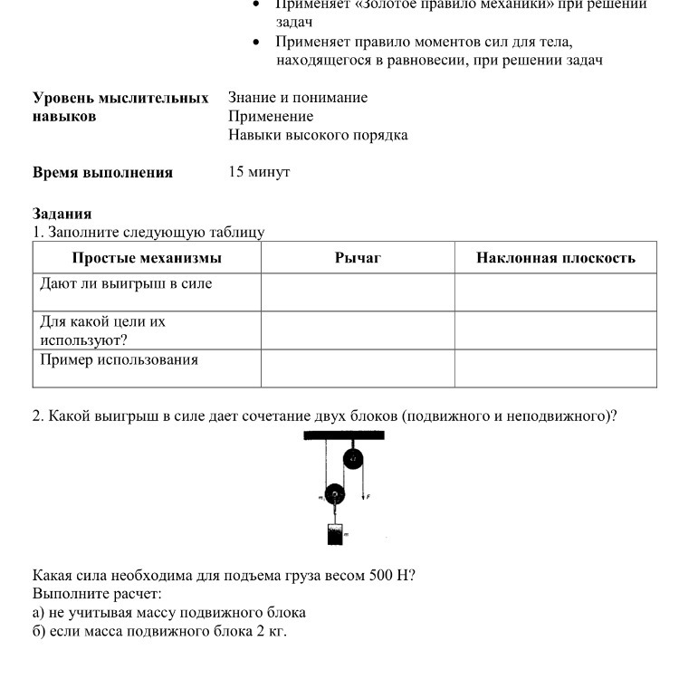 1.2.1. Рычаг используется для создания большего усилия на коротком плече с помощью меньшего усилия на длинном плече (или для получения большего перемещения на длинном плече с помощью меньшего перемещения на коротком плече). Проще говоря, его используют, чтобы поднимать тела, прилагая к ним силу меньше их веса.