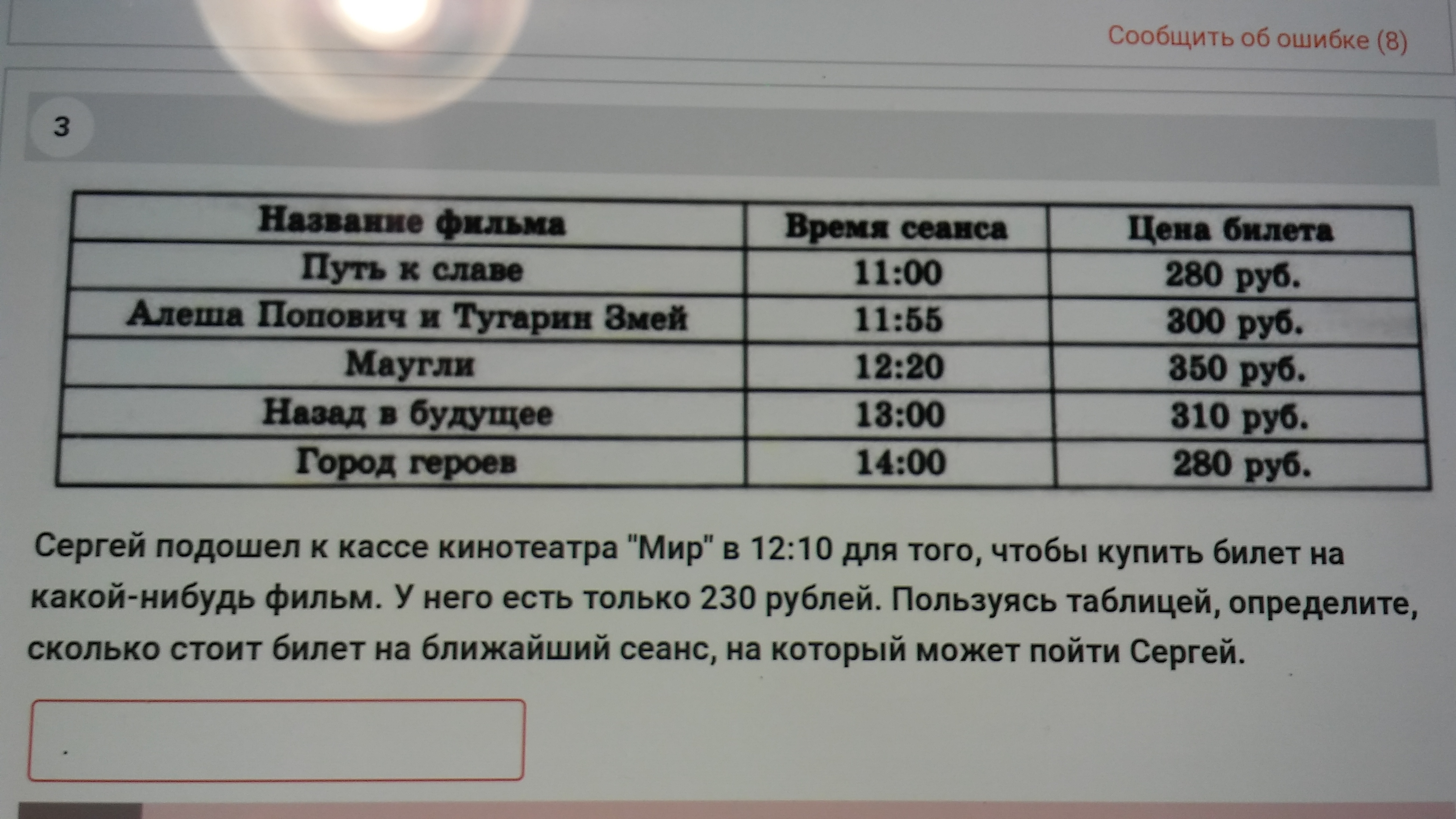 И так Сергей не может пойти на фильм так как у него всего 230 рублей,а самый дешевый билет стоит 280 рублей,а у Сергея 230. Ответ:Никакой!