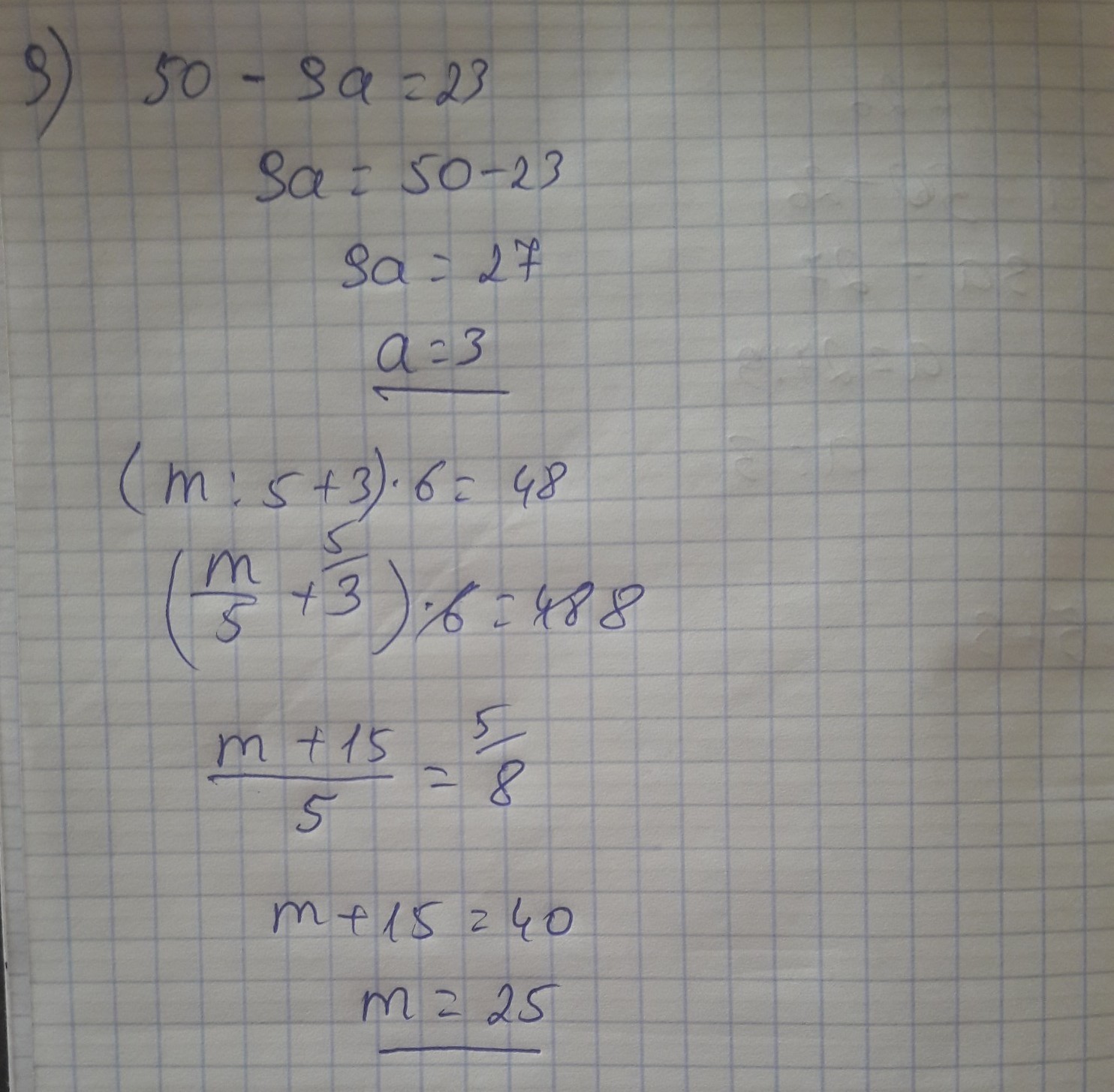 1) 50- 9 × a = 23 2) (m : 5 + 3) × 6 = 48