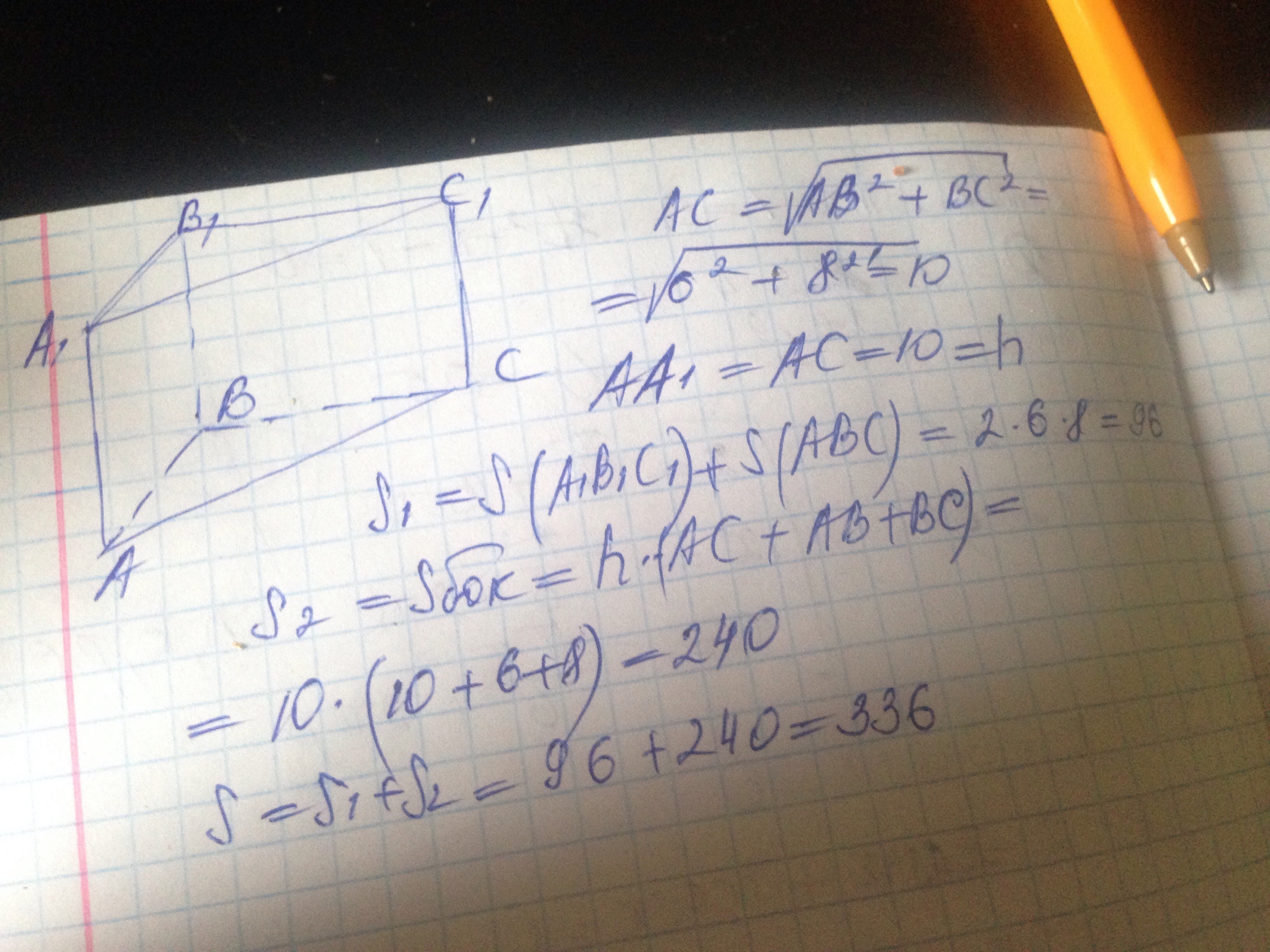 Основание прямой призмы – прямоугольный треугольник с катетами 6см и 8см. Найдите площадь боковой поверхности призмы, если ее наибольшая боковая грань – квадрат.