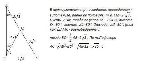 медиана проведённая к гипотенузе прямоугольного треугольника равна 1 и делит прямой угол в отношении 1:2. найдите площадь треугольника.