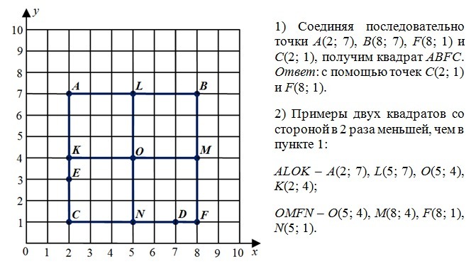 2)Запишите координаты вершин квадрата, сторона которого в 2 раза меньше стороны квадрата, построенного в пункте 1. Приведите 2 примера.