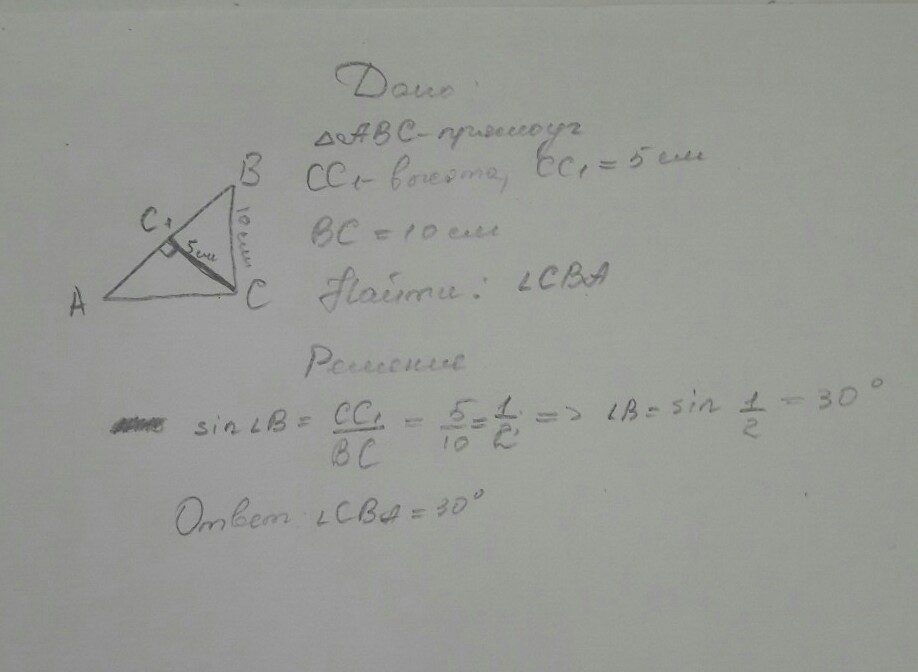 СС1-высота,СС1=5 см,ВС=10 см. Чему равен угол СВА?