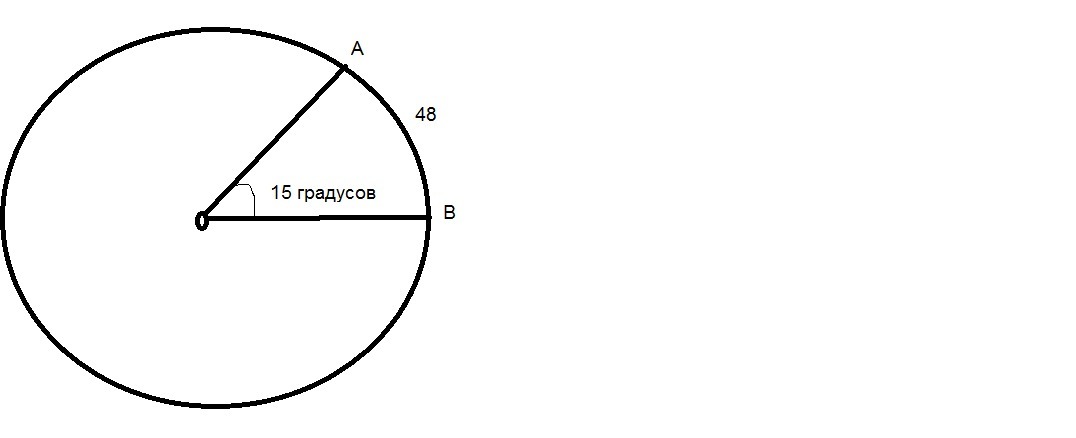 Длина полной окружности L с углом поворота 360° и радиусом R: L=2*пи* R. У нас дан неполный оборот на 15° и длина неполной окружности (дуги от В до А, против часовой) 48. Полная составит 360/15*48=1152. Радиус ОА=ОВ=L/2пи= 183.3.Длина дуги от А до В 1104