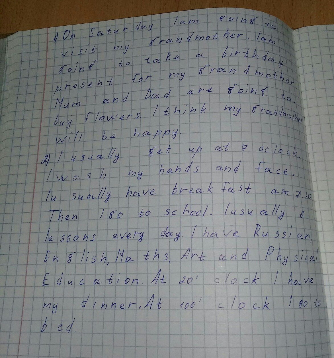 1)Он сатудэй ай эм го инг ту визит май грендмазер . Ай эм гоинг ту тэйк э бёздэй презент фор май грендмазер. Мам эн дэд ар гоинг ту бай флауэрс ай финк май грендмазер уилл би хэппи . 2) ай южэлли гет ап эт сэвен о клок . Ай вош май хэндс эн фейс. Ай южэлли хэв брэкфаст эм э хаф паст сэвен. Зен ай гоу ту скулл эт эйт о клок . Ай южэлли хэв сикс лэссонс евридэй. Ай хэв рашен, инглиш, мэс, арт эн физикл эдьюкейшн . Эт твэнти о клок ай хэв май диннер. Эт тен о клок ай гоу ту бед