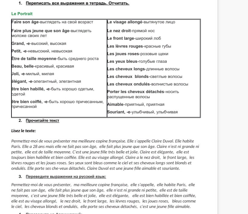 3. Разрешите мне представить вам, мою лучшую французскую подругу, её зовут, она живёт в Париже, она не выглядит на свой возраст, она выглядит моложе своих лет, она не высокая и не маленькая, она среднего роста, она очень красивая и милая девушка, она элегантная, она хорошо одета и причёсанна, у неё вытянутое лицо, прямой нос, широкий лоб, красные губы и розовые щеки, синие как небо, светлые волнистые волосы, она носит распущенные волосы, это приятная и улыбчивый девушка.