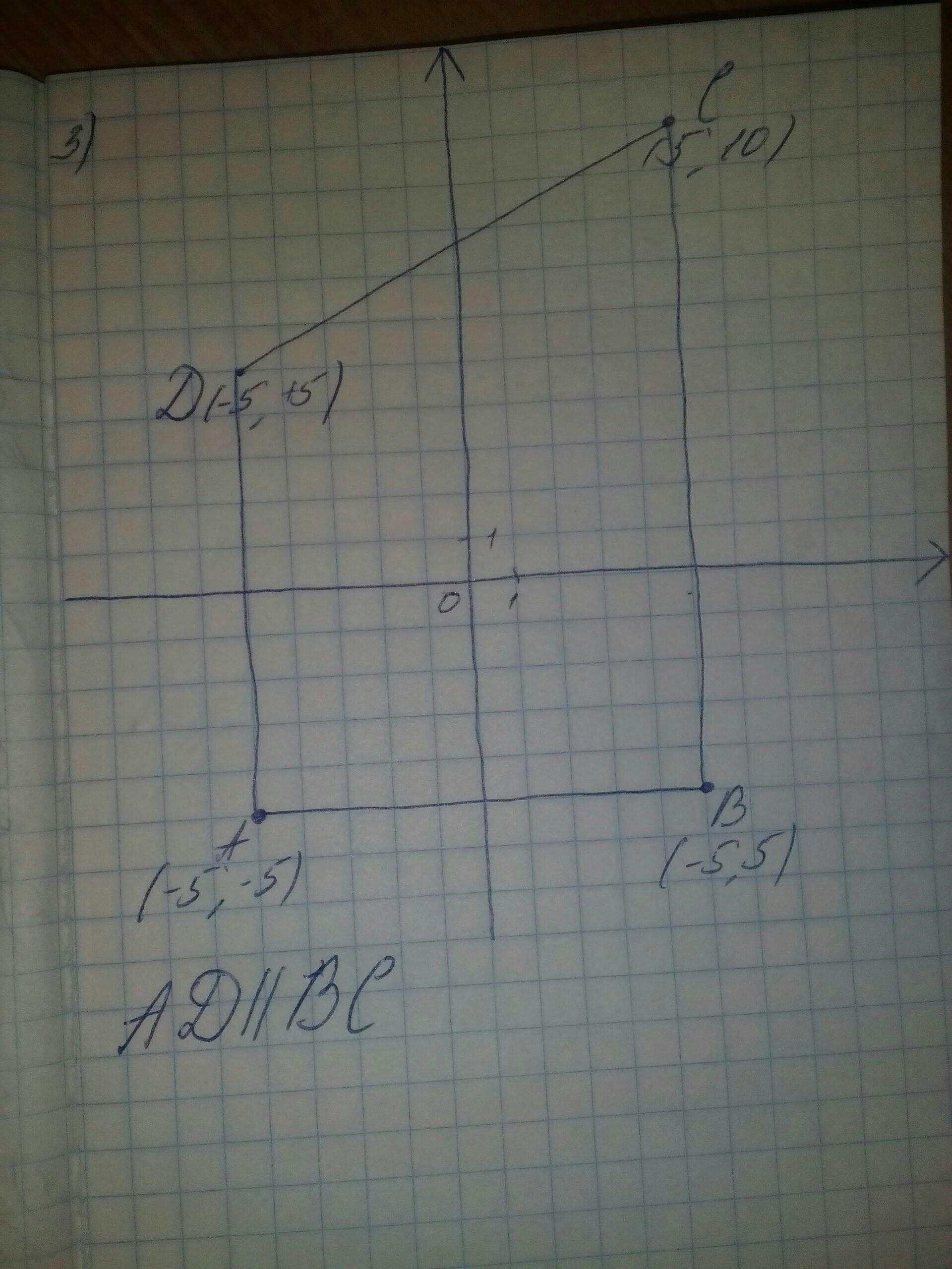 1.Начертите две перпендикулярные прямые.Отметьте точку,не лежащую ни на одной из этих прямых. 2.Начертите прямую L и отметьте точку M,лежащую на этой прямой.Через точку M проведите прямую,перпендикулярную L.Отметьте на этой прямой точку N и проведите через N прямую,параллельную L. 3.Постройте на координатной плоскости четырёхугольник ABCD,если A(-5,-5), B(5,-5), C(5,10), D(-5,5). Отметьте пары параллельных прямых. Помогите пожалуйста срочно!