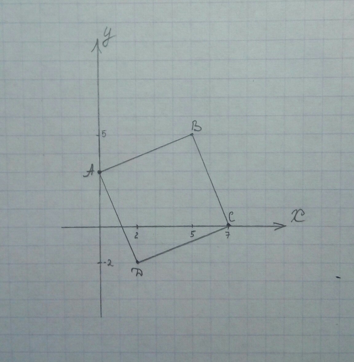 Постройте на координатной плоскости квадрат с вершинами в точках А(0;3), В(5;5), С(7; 0), D (2; -2).